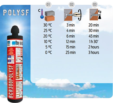 Для установки химического анкера BCR 400 POLY SF Bossong рекомендуется рабочая температура от -40°C до +50°C. Время схватывания составляет от 6 до 25 минут в зависимости от температуры окружающей среды. Время отверждения составляет от 20 до 180 минут.