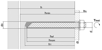 tfix макс. толщина прикрепляемого материала L длина крепежного элемента f длина резьбы hnom мин. глубина анкеровки hmin мин. толщина бетона h1 мин. глубина сверления d0 диаметр сверла Tinst момент затяжки |