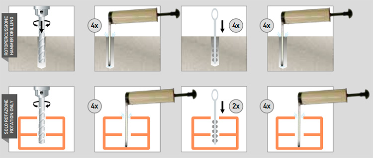 Расход химического состава зависит от материала основания и геометрических характеристик анкерного крепления. В соответствии с регламентом на монтаж химических анкеров, установка считается выполненной правильно, если излишки химического состава выступили из отверстия. Расчет расходования химического состава инжекционной массы производится по соответствующим формулам и зависит от степени пористости материала.