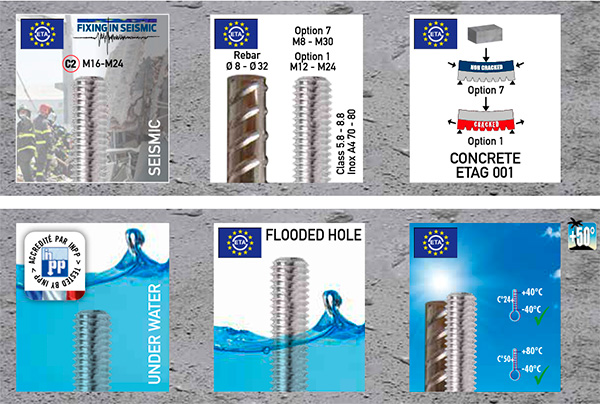 Продукт сертифицирован для использования с широким спектром резьбовых стержней (от M8 до M30) и арматуры (диаметром от 8 мм до 32 мм). Вы можете использовать его во влажном бетоне и затопленных отверстиях, не увеличивая вдвое время отверждения (снижение рекомендуемых нагрузок на 20%). Option 7 от M8 до M30 для бетона без трещин и Option 1 для установки в бетон с трещинами со стержнями от M12 до M24. Сертифицирован для крепления с переменной глубиной анкеровки. Это означает, что инженер-проектировщик имеет значительную гибкость на этапе проектирования при применении данного продукта. Сертифицированные рабочие температуры находятся в диапазоне от -40 ° C / + 80 ° C.