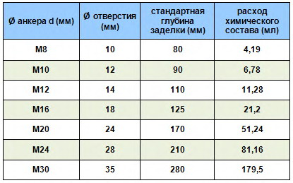 Расход химического состава зависит от материала основания и геометрических характеристик анкерного крепления. В соответствии с регламентом на монтаж химических анкеров, установка считается выполненной правильно, если излишки химического состава выступили из отверстия. Расчет расходования химического состава инжекционной массы производится по соответствующим формулам и зависит от степени пористости материала.