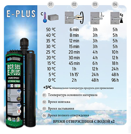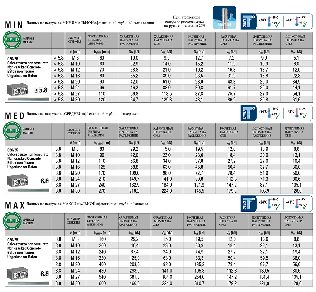 Продукт сертифицирован для использования с широким спектром резьбовых стержней (от M8 до M30) и арматуры (диаметром от 8 мм до 32 мм). Вы можете использовать его во влажном бетоне и затопленных отверстиях, не увеличивая вдвое время отверждения (снижение рекомендуемых нагрузок на 20%). Option 7 от M8 до M30 для бетона без трещин и Option 1 для установки в бетон с трещинами со стержнями от M12 до M30. Сертифицирован для крепления с переменной глубиной анкеровки. Это означает, что инженер-проектировщик имеет значительную гибкость на этапе проектирования при применении данного продукта. Сертифицированные рабочие температуры находятся в диапазоне от -40 ° C / + 80 ° C.