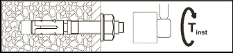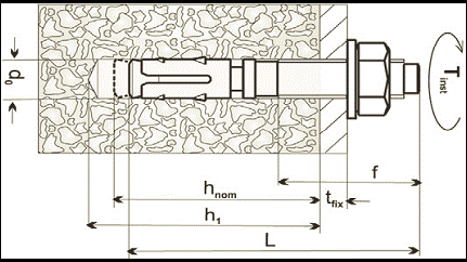 | tfix  макс. толщина прикрепляемого материала L длина крепежного элемента f длина резьбы hnom мин. глубина анкеровки hmin мин. толщина бетона h1 мин. глубина сверления d0 диаметр сверла Tinst момент затяжки |   |
