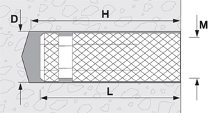 Характеристики: анкер имеет шероховатую поверхность, что позволяет избежать прокручивания анкера при монтаже.  При закручивании шпильки(болта), гильза (с внутренней частью конической формы) расширяется и прижимается к поверхности отверстия.