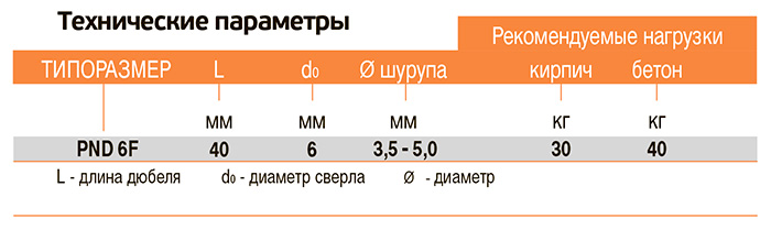 Характеристики: дюбель PND F обладает очень хорошей прижимной силой за счет своего широкого фланца. Может использоваться как альтернатива дюбель-гвоздя с грибовидной головкой. Данный дюбель используется совместно с универсальными шурупами.