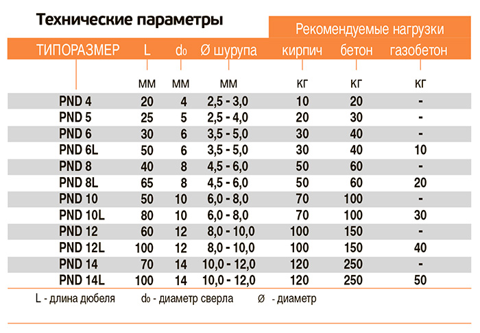 Характеристики: дюбель из полиамида (нейлон) для небольших нагрузок. Может использоваться при температуре от -40 до +80 °С.