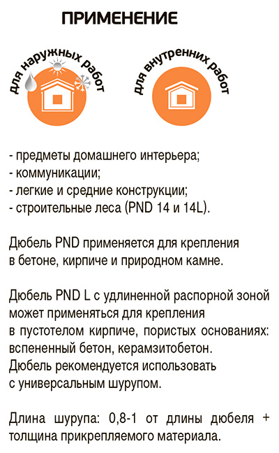 Применение: крепежный элемент, совместно с шурупами и саморезами предназначенный для монтажа различных конструкций и оборудования в полнотелые материалы (бетон, железобетон, кирпич, природный камень).