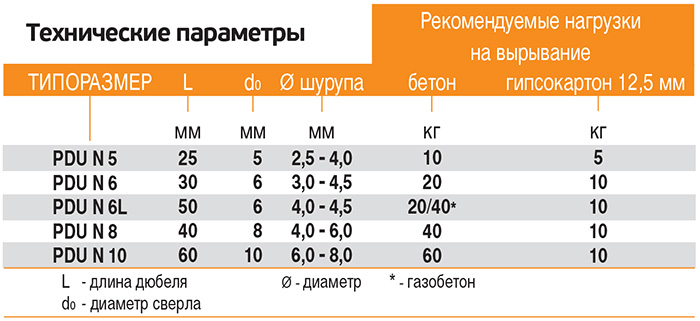Применение: дюбель PDU-N (PDU-N-L) используется при монтаже в таких основаниях как: бетон, ГВЛ, газобетон, гипсокартон, кирпич полнотелый, легкий бетон, пустотелый кирпич