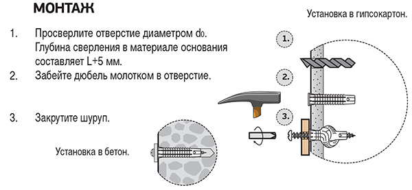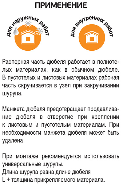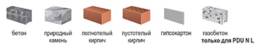 Применение: дюбель PDU-N (PDU-N-L) используется при монтаже в таких основаниях как: бетон, ГВЛ, газобетон, гипсокартон, кирпич полнотелый, легкий бетон, пустотелый кирпич