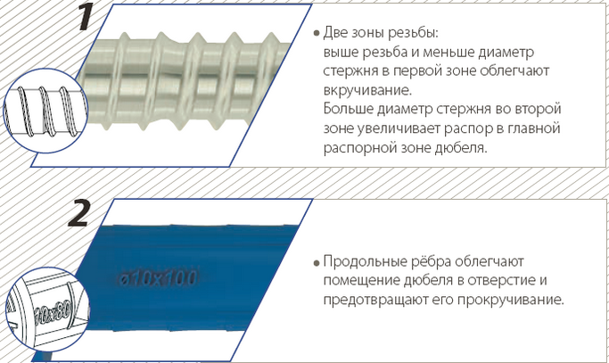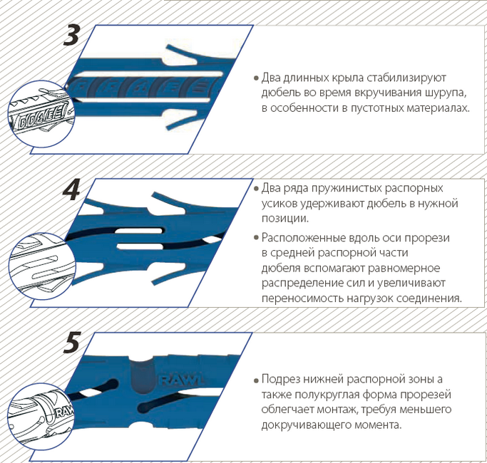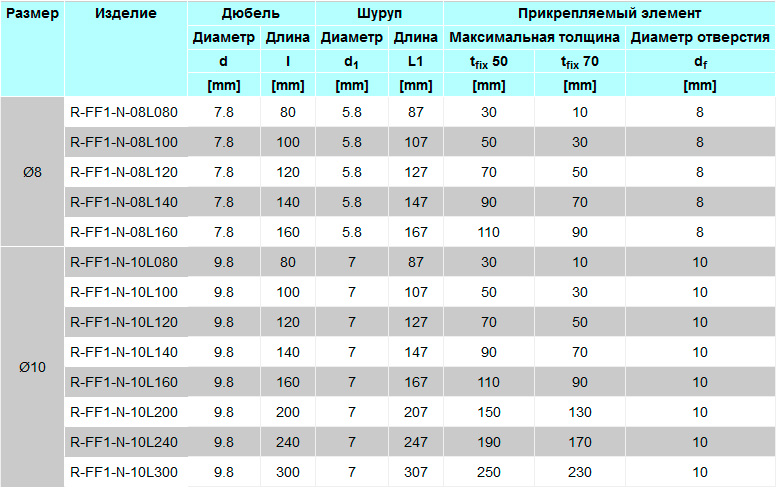 Характеристики шурупа: конусообразная, со шлицем типа TORX 30 у R-FF1-N-08L и TORX 40 у R-FF1-N-10L, дает возможность дюбелю сравняться с поверхностью прикрепляемого элемента;