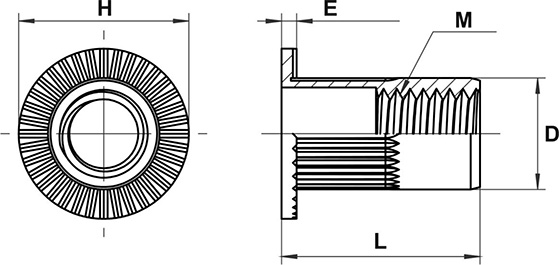 | Размер резьбы (M) | Длина тела заклепки (L), мм | Диаметр тела заклепки (D), мм | Толщина борта (E), мм | Диаметр борта (H), мм | Диаметр просверливаемого отверстия, мм | Рекомендуемая толщина соединяемых материалов, мм |