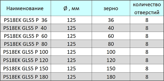 Характеристики: шлиф диск PS18EK GLS5 также, как и шлиф диск PS18EK предназначены для шлифования поверхности, выравнивания поверхности, снятия краски или лаков, зачистки от ржавчины. Шлиф диск PS18EK в зависимости от зерна имеет различное применение. Различие между шлиф диск PS18EK GLS5 и шлиф диск PS18EK в том, что шлиф диск PS18EK GLS5 имеет специализированные отверстия для внутреннего пылеудаления через пылесос из эксцентриковой шлифмашины.
