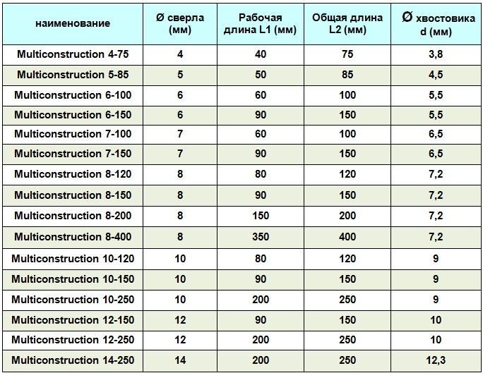 Характеристики: сверление сверлами Multiconstruction осуществляется с обычными и ударными дрелями, а также дрелями-шуруповертами. При обработке керамической плитки склерометрической твердостью 8 сверление выполнять с пониженной частотой вращения до 400-600 об/мин. При сверлении кирпичной кладки с вертикальными пустотами не происходит изломов перегородок. При сверлении с использованием аккумуляторных дрелей-шуруповертов зарядки аккумулятора хватает для сверления на 40% больше, чем обычно.