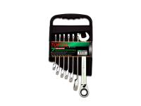 Набор ключей комбинированных с трещоткой PRO SERIES TOPTUL состоит из 7 предметов размером 8, 10, 12, 13, 14, 17 и 19 мм, имеющих окончание в виде рожкового ключа с одной стороны и окончание в виде накидного ключа-трещотки с другой стороны. Механизм храповика имеет переключатель и способен работать как на зажим, так и на отворот. Набор оснащен удобным пластиковым держателем-переноской.