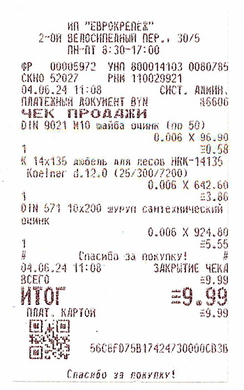 | Образец кассового чека: |